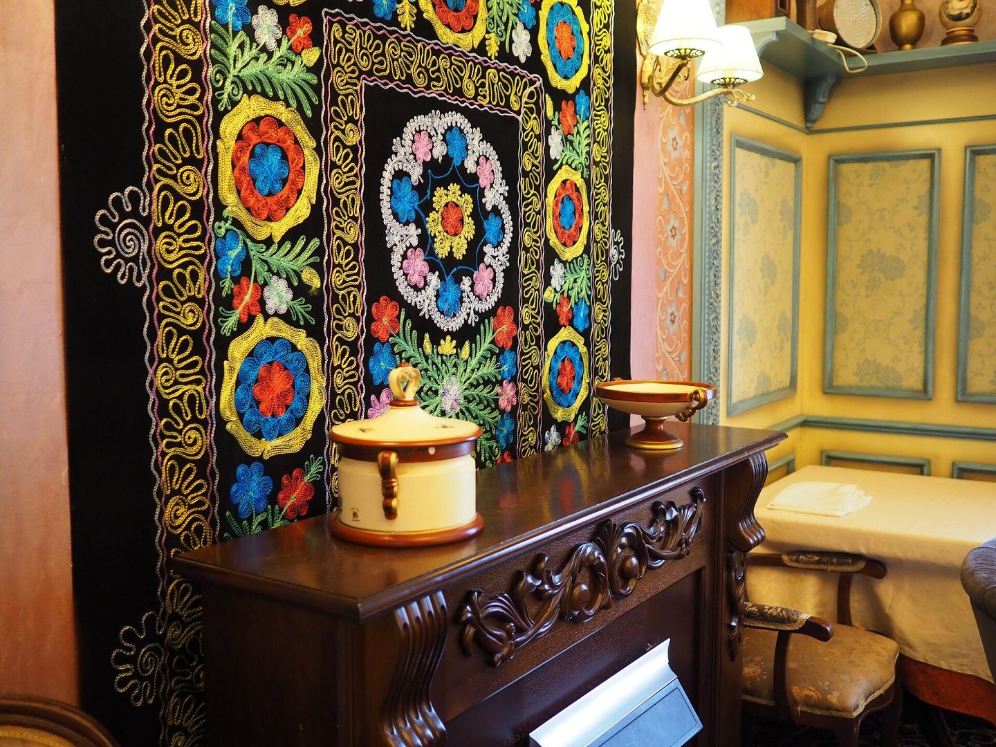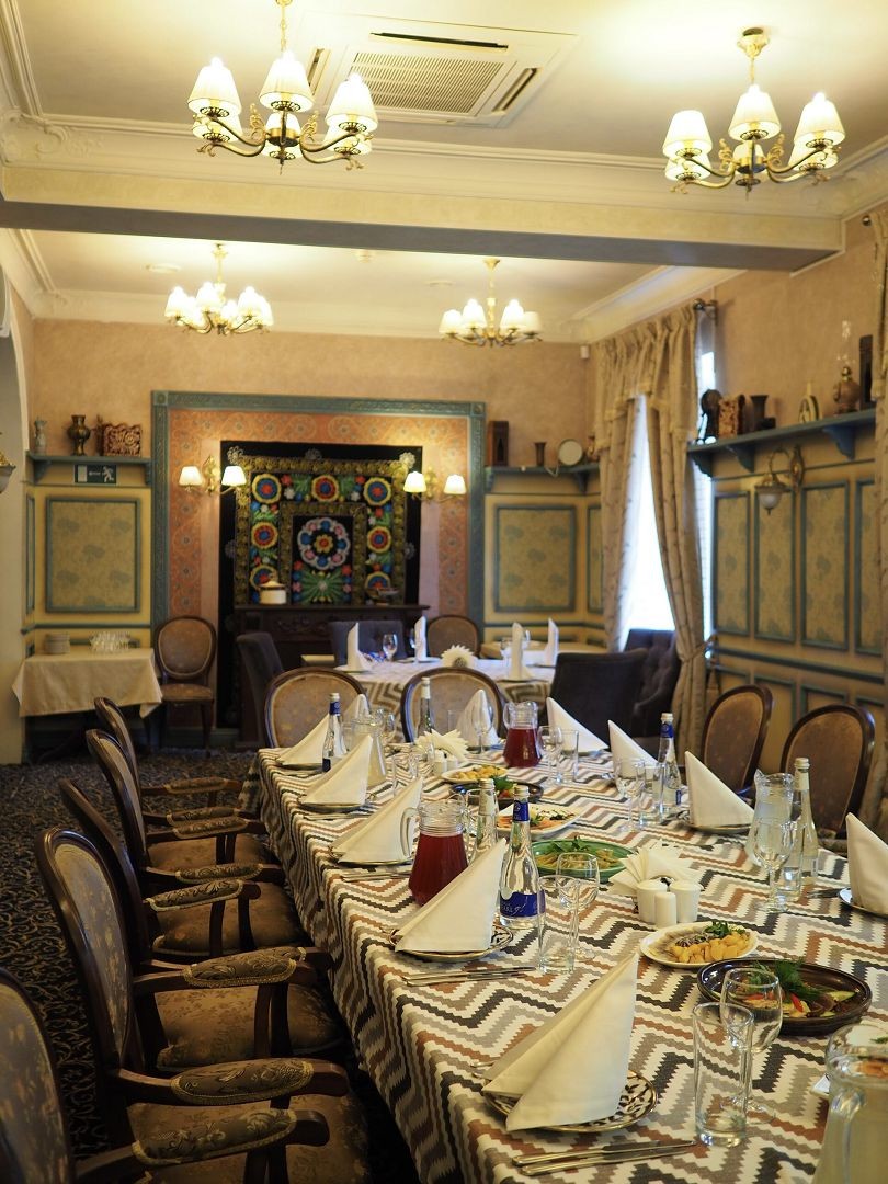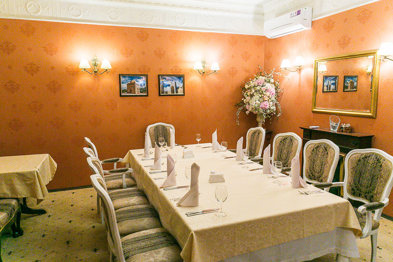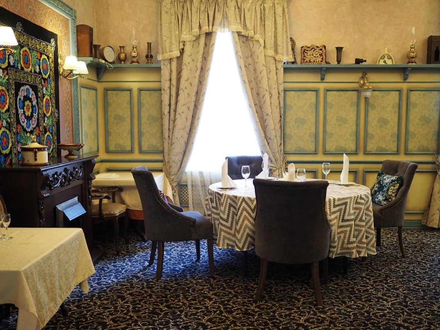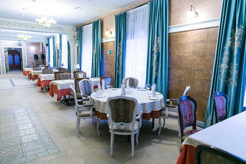 Посетителей поразит изысканный интерьер помещений, который окунёт вас в особую атмосферу былых времён. Дизайнеры использовали для оформления зала элегантную мебель, дорогой текстиль и антикварные предметы. Максимально комфортный отдых вам обеспечит вежливый и хорошо обученный персонал.